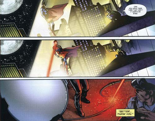 Of the last two issues, I got a kick out of Superman doing his level best to help a girl in crisis. Superman puts on his therapist hat and gives a potential jumper all the time she needs to calm down. When she asks if he could do something about the spotlight shining right in her eyes, he zaps it off. Given enough time, Superman could keep at it with his super therapy and zap Prozac right out of existence. Now, that’s a superhero.