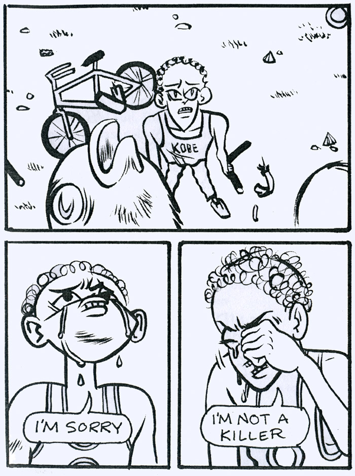 Getting to know Verhoeven’s style from her illustrations and other work, I’m impressed with the distinctive look to this comic. There’s a driven quality, sometimes a rough and jagged line, that gives the story an added punch. It feels like the drawings are sometimes done quickly, especially at agitated moments, and then, at quieter moments, the expressive line slows down, smooths out, and picks up more detail. Given the constant shift in the plot, it makes sense. The characters are all children living in a densely packed multi-racial urban neighborhood. Tensions can flare up easily for no reason. As far as Ty is concerned, the self-proclaimed king of the hood, there’s always a reason why he is displeased and crazy angry. His face, angular and forceful, looks like it’s never known any rest.